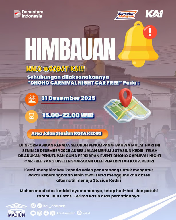 PT Kereta Api Indonesia (Persero) Daerah Operasi 7 Madiun mengimbau para pelanggan kereta api yang akan berangkat dari Stasiun Kediri pada Rabu malam, 31 Desember 2025, untuk datang lebih awal ke stasiun, minimal 1 (satu) jam sebelum jadwal keberangkatan kereta api. Imbauan ini disampaikan sebagai langkah antisipatif menyusul adanya potensi kepadatan arus lalu lintas menuju…