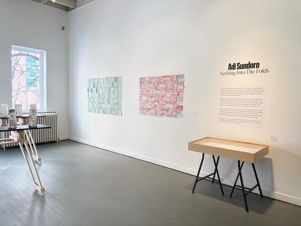 Dalam pameran bertajuk Seeking into The Folds, Adi Sundoro menghadirkan instalasi berbasis media kertas yang terinspirasi dari fenomena keseharian di Indonesia: penggunaan dokumen rahasia sebagai pembungkus gorengan oleh pedagang kaki lima.